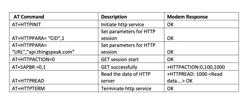 AT+HTTPINIT AT+HTTPPARA="CID",1 AT+HTTPPARA="URL","http://api.weather.com/temp?city=London" AT+HTTPACTION=0 // Wait for +HTTPACTION response AT+HTTPREAD AT+HTTPTERM |