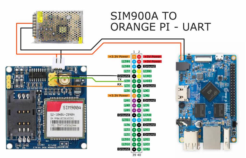 To connect an Orange Pi to a SIM900A module, first wire the SIM900A’s TX pin to the Orange Pi’s RX pin (UART receive) and the SIM900A’s RX pin to the Orange Pi’s TX pin (UART transmit), ensure both devices share a common ground (GND), and power the SIM900A with a stable 5V/2A supply; then enable the Orange Pi’s UART interface by configuring the device tree or boot parameters, install a serial communication tool like minicom or pyserial in Python, and finally test the connection by sending basic AT commands (e.g., AT or AT+CSQ) through the serial port (typically /dev/ttyS1 or /dev/ttyUSB0 if using a USB adapter). For OS Installation please refer to this link / For Third pary operating system image please refer to this link